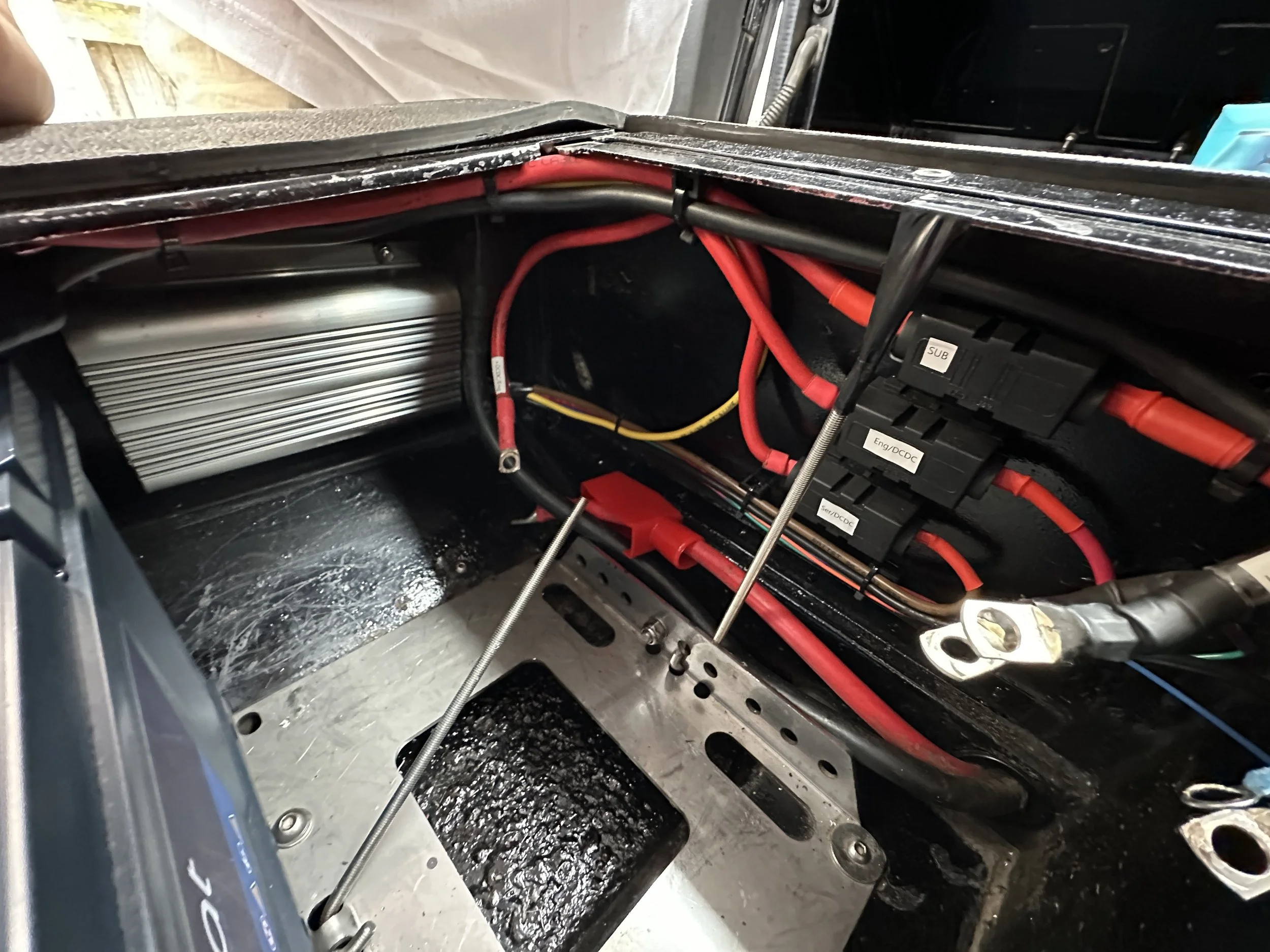 I accumulated all the components for the base system. My plan was to use the negative space in front of the drawer system as two storage lockers. The smaller locker sits behind the battery box and houses all the consumer protection and terminals, fuse blocks, isolators, bus bars, etc.