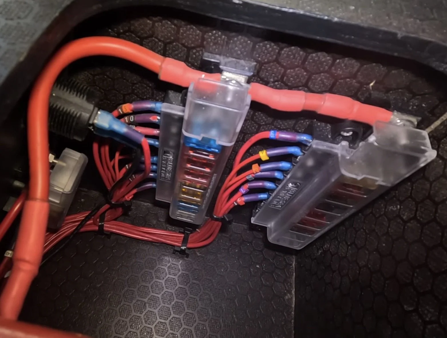 This meant I could run one large cable from the house battery into the storage box and neatly install all the fuses and protection there. From this box, separate power feeds run around the truck to their various consumers.