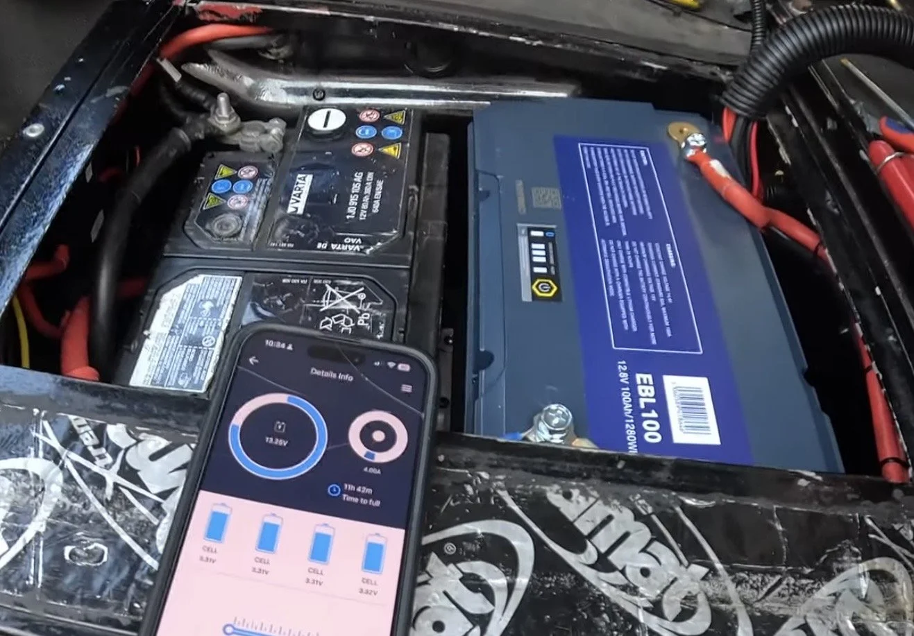 I went with a 100Ah LiFePO4 Ecobat battery with an internal BMS that connects to my phone via Bluetooth for real-time monitoring of current draw, charging, and battery state. I chose this battery because it was a direct fit into the existing battery box (previously held a 90Ah Odyssey Extreme AGM battery), meaning minimal system modification.