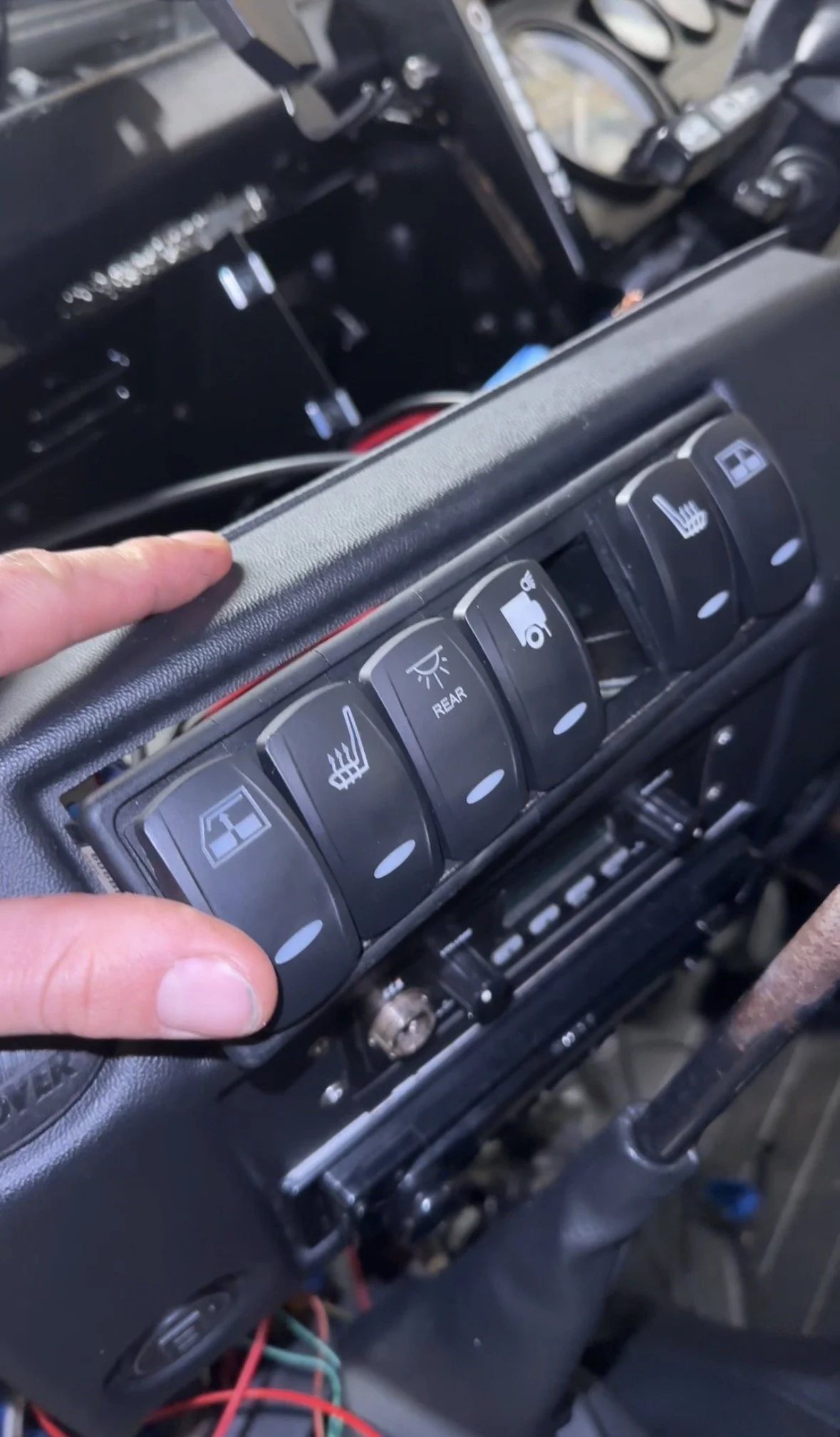 A large group of cables then run from the electrics box along the chassis, up the bulkhead, and behind the dash panel. Behind the dash, I have a negative bus bar, terminal blocks, consumers (plug sockets, stereo, etc.), and a row of 7 Carling switches for lights, windows, and other functions.